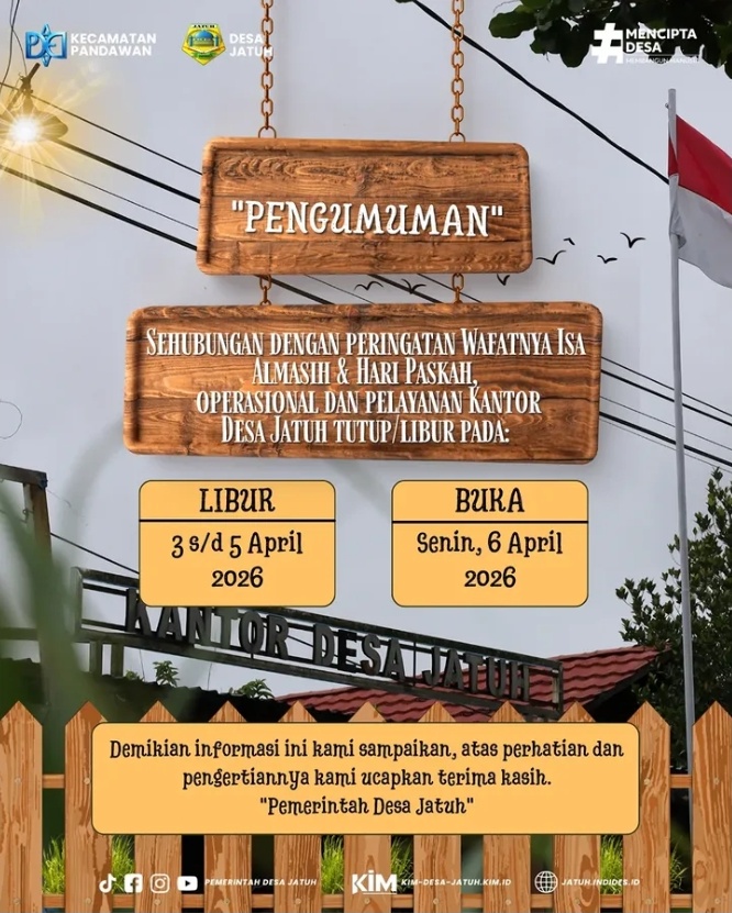 Dalam rangka memperingati libur nasional, bersama ini disampaikan kepada seluruh masyarakat Desa Jatuh bahwa pelayanan di Kantor Desa Jatuh ditutup sementara pada tanggal 18 sampai dengan 24 Maret 2026. Pela… selengkapnya