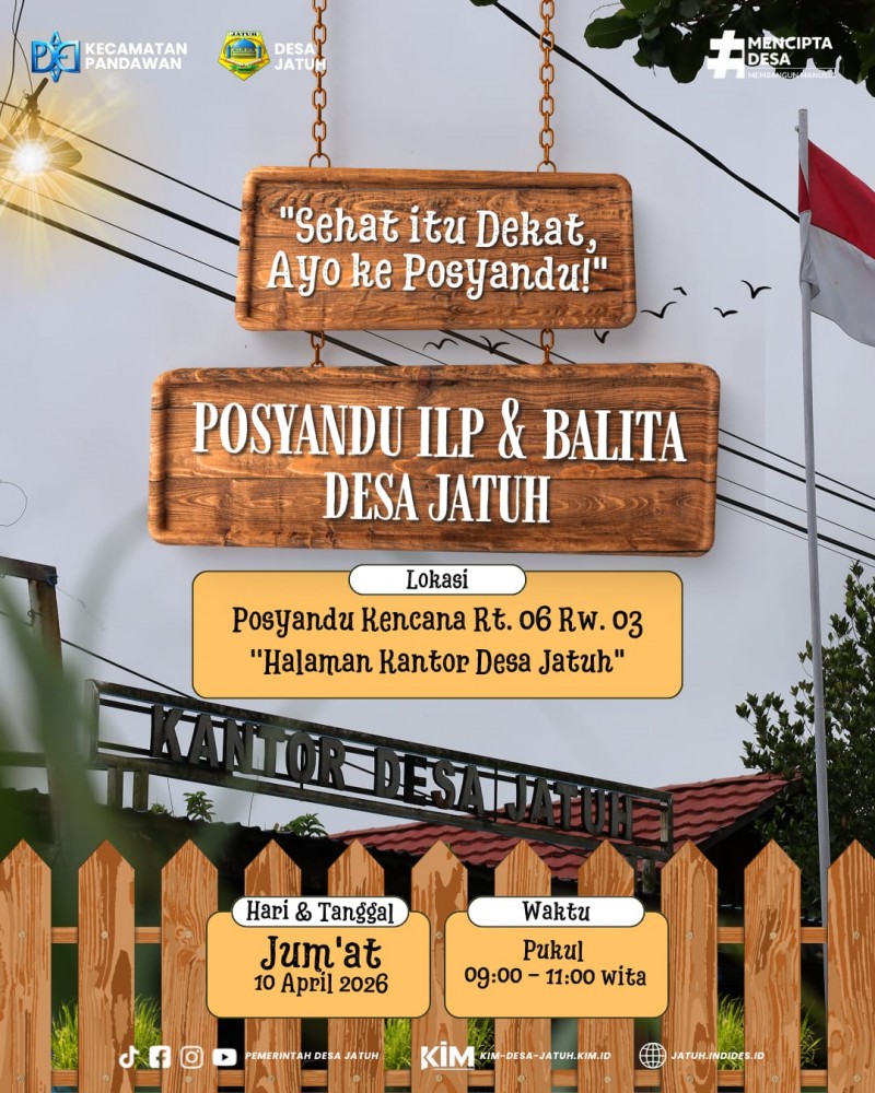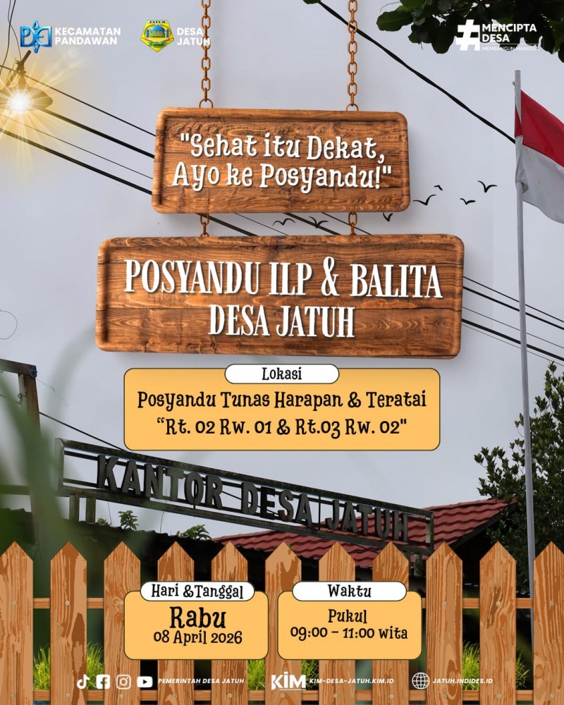 Diberitahukan kepada seluruh masyarakat Desa Jatuh bahwa akan dilaksanakan kegiatan Posyandu ILP dan Balita pada: Hari/Tanggal : Rabu, 08 April 2026 Waktu : Pukul 09.00 – 11.00 WITA Tempat : Posyandu Tunas … selengkapnya